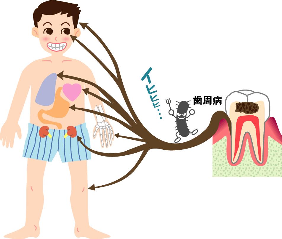 痛みなどの症状が特になくても細菌は全身で悪さをしています。免疫力で押さえつけられているうちは特に症状を感じることなく生活できます。しかし悪い炎症が長く続くことにより、思いもしなかった症状を引き起こします。例えば脳血管障害、心筋梗塞などです。