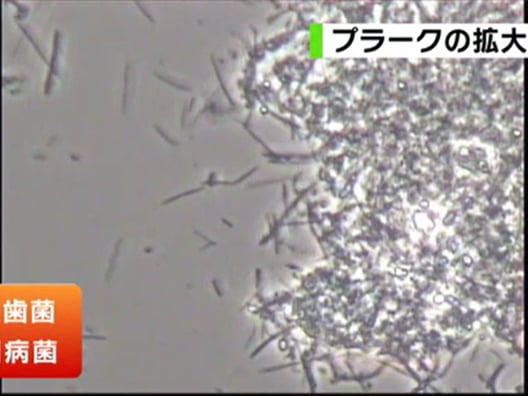 またプラークは一見食べカスに見えますが、実際にあの白いべたべたを顕微鏡で見てみると細菌がうじゃうじゃいるのです。そのプラークを取り培養し細菌の数を計算してみると、口の中のおおよその菌の数は10の8乗つまり1000万個もいることがわかりました。