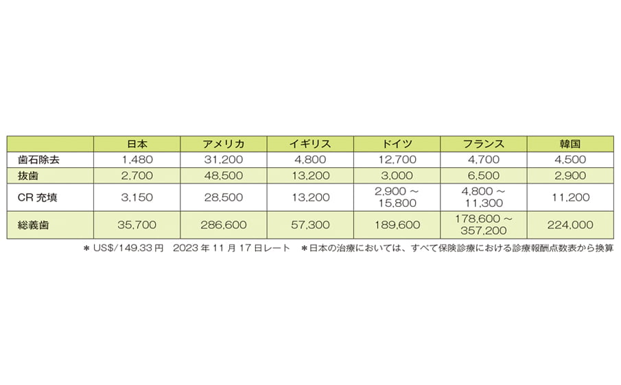 この表は日本歯科医師会による定例記者会見において末瀬一彦氏(日歯常務理事)より、海外の歯科治療費について各国歯科医師会(FDI2023参加国)の協力を得て調査した内容の一部となります。