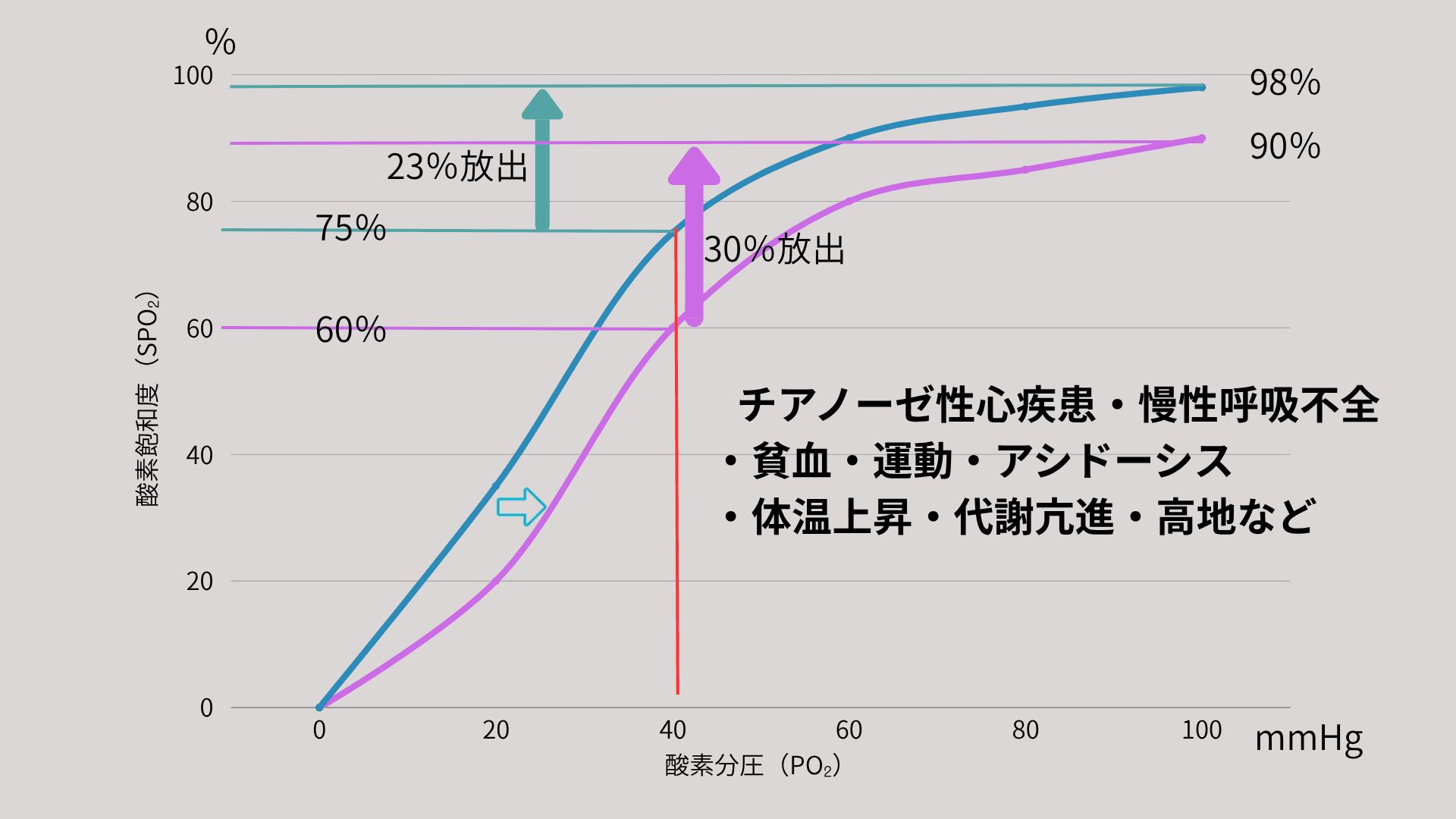 - 多血症、酸素解離曲線の右方移動によって、酸素運搬が維持されている。