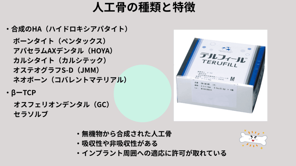 - リフィット:骨の無機成分である低結晶性ハイドロキシアパタイトと、有機成分である豚真皮由来のコラーゲンからなる弾力のある骨補填材(含有比率8:2)