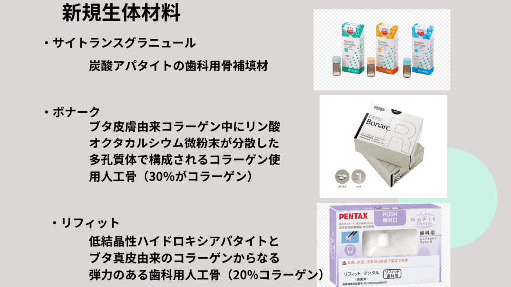 - サイトランスグラニュール:世界初の「炭酸アパタイト」を主成分とする、国内初の「インプラント適用」が認められた顆粒状の骨補填材