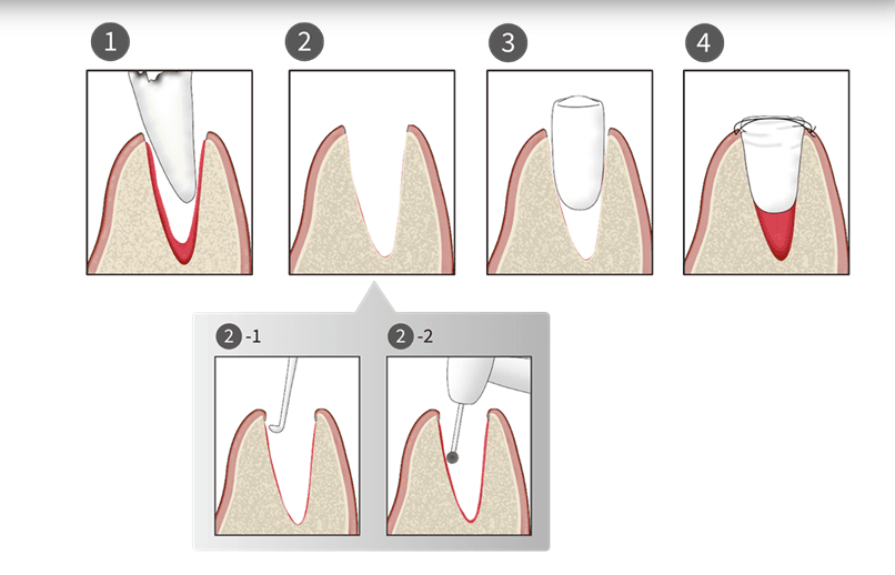 - 抜歯創の肉芽を掻把、骨面を露出させる。②-1:掻把②-2:不良肉芽をバーで削合し、新鮮骨面を出す。