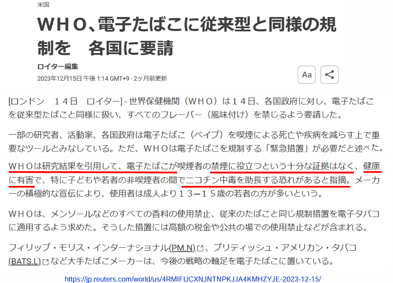 WHOは電子タバコを禁煙に役立つ根拠が不十分のため規制するように各国政府に要請しています。(従来たばこ同様)
