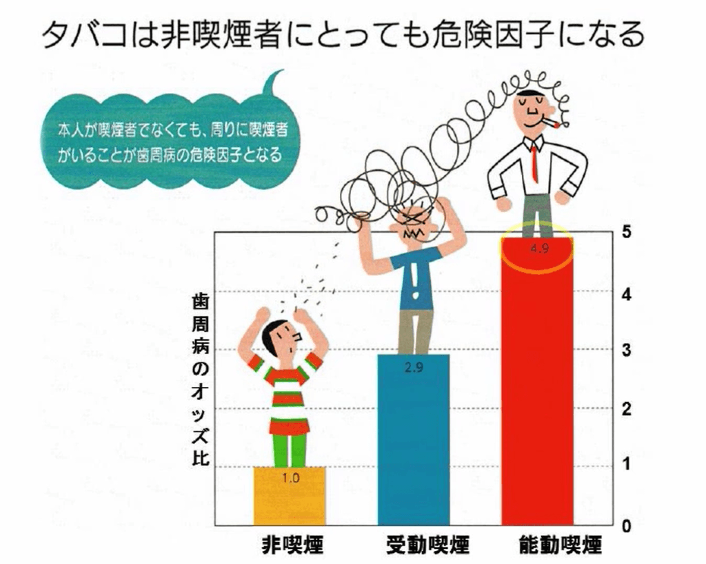 受動喫煙により、3倍近く歯周病になりやすくなります(喫煙者は5倍)