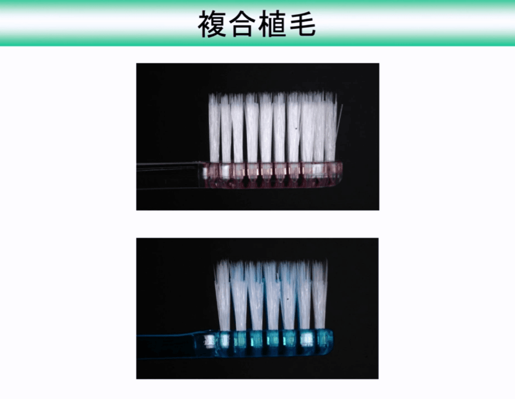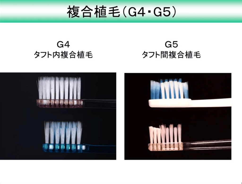 中央の細い毛が細部に、側面の短い毛が歯面に当たることにより密着度を高めているのがG4のタフト内複合植毛です。