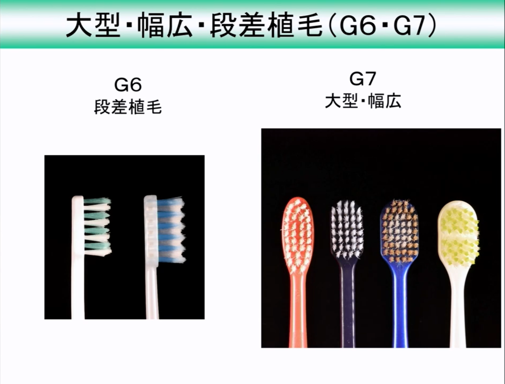 ◦歯ブラシの効率を最大限に考えていかなければならないので、比較的大型でガシガシと磨いた時になるべく当たるように山切りにしたものがG6も段差植毛です。