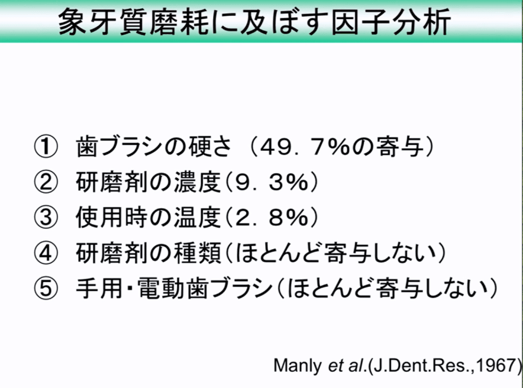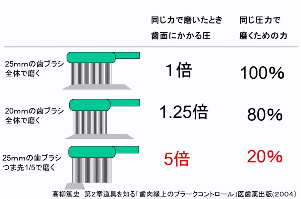 4.~6.は圧力の問題で、日本人はエナメル質が薄くまた歯肉が薄い方が多いので、特にブラッシング圧は200g程度に抑えておかないと、自分で自分の体を傷つけることとなります。私が圧について説明する時によくお伝えしている事は、歯ブラシで自分の肌をゴシゴシ擦ったら痛いですよね?ということです。歯肉は一度下がってしまうと基本的に元には戻りません。また、力を入れると毛先が曲がってしまい清掃効率が悪化します、箒と同様です。