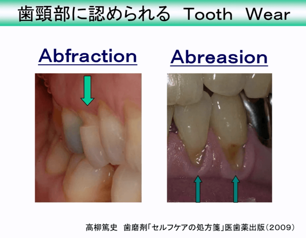 左のアブフラクションは、くいしばりや歯ぎしりの方に多い特徴があります。その形態は歯ブラシの毛先を同じ軌道に誘導しやすいため、さらなる摩耗を促し、歯肉が周辺で炎症を起こす(フェストゥーン)右のアブレ―ジョンに移行しやすいです。