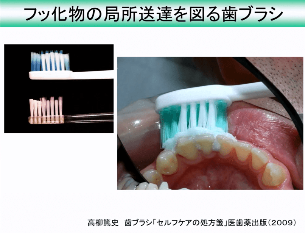 歯ブラシの毛先が届きにくい所にいかにフッ化物を届けられるかが重要となります。そのため、長短のある複合植毛や山切りカットなど段差植毛は局所デリバリーに有効です。