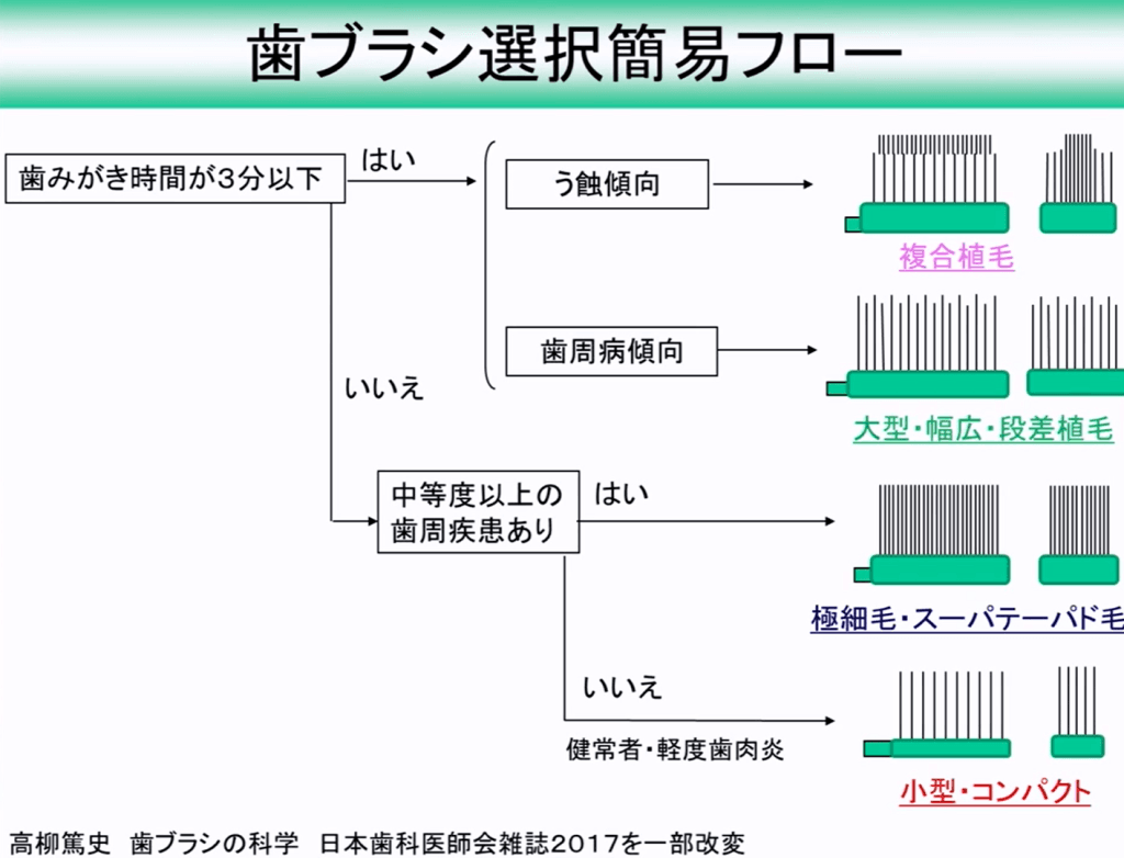 これは歯科衛生士が検診の際に、どのタイプの歯ブラシがその人に適しているかを年代別に分けたものです。