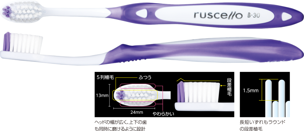 歯間と歯周ポケットに毛先が入りやすいように極細毛とラウンド毛が配列された複合植毛で段差植毛です。