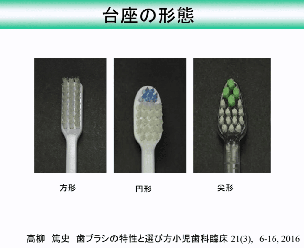 ◦方形は前歯の裏側を縦磨きするときに先端やかかと部分を使うと磨きやすいです。しかし、一番奥まで磨こうとすると四角の角が一つ手前の歯に当たった感触で奥まで磨いたと勘違いしてしまいやすく注意が必要です。