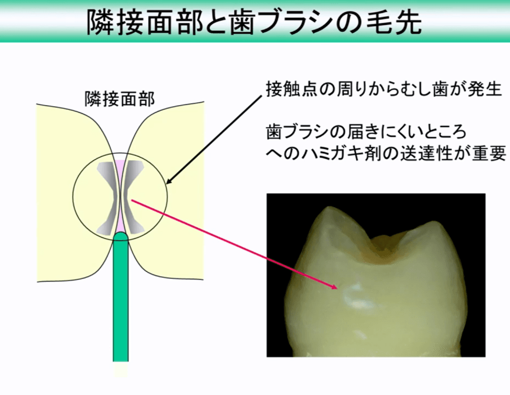 歯間部中央に対して歯ブラシの毛先ではどうしても到達させることができません。物理的に擦過できるフロスが一番適しています。
