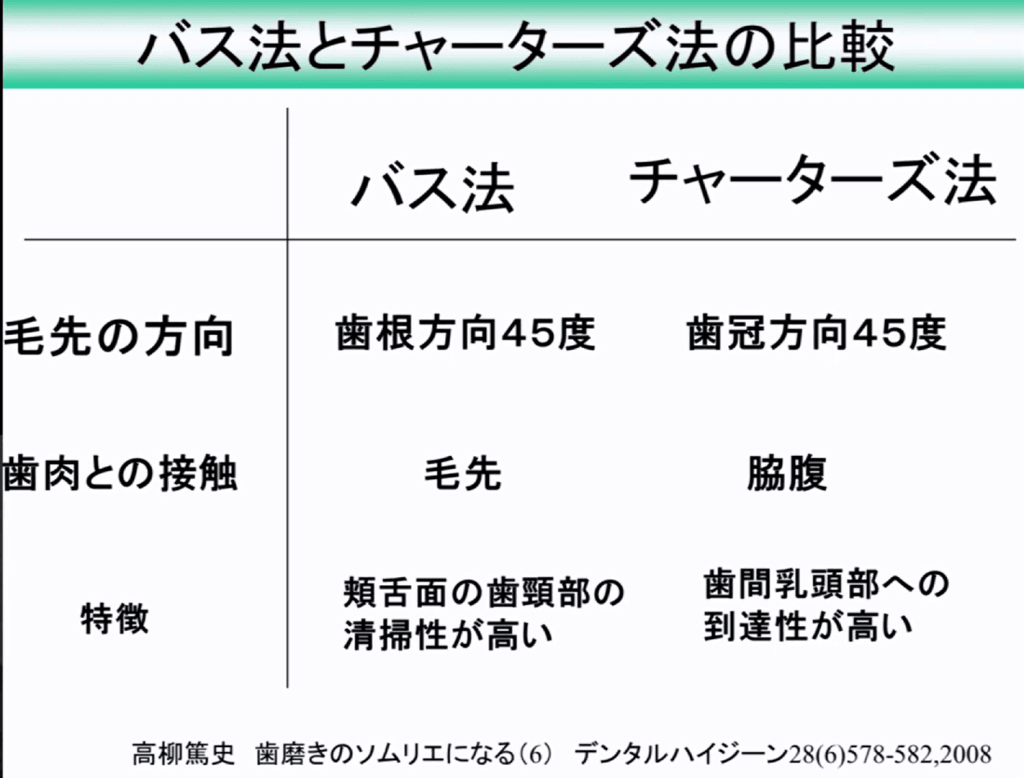 しかし、歯間部の奥の方には到達性は悪いので、歯間乳頭部の歯肉の炎症が強い方や歯間部のう蝕予防に効果的な方法は左のチャーターズ法で、真横から上方45度に当てて磨くと有効となります。