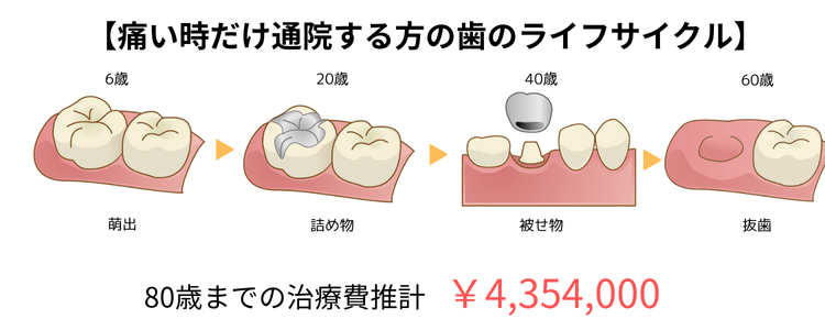 上記は、定期的に歯科医院にて歯科健診を行い、早め早めに根本治療に取り組んでこられた方と、痛いところだけ治して他は放ったらかしにしていた方の生涯治療費の例です。早め早めに根本治療を行い、抜歯リスクを抑え、天然歯を残すように調整してきた方とそうでない方の生涯治療費ってこんなに違うんです。